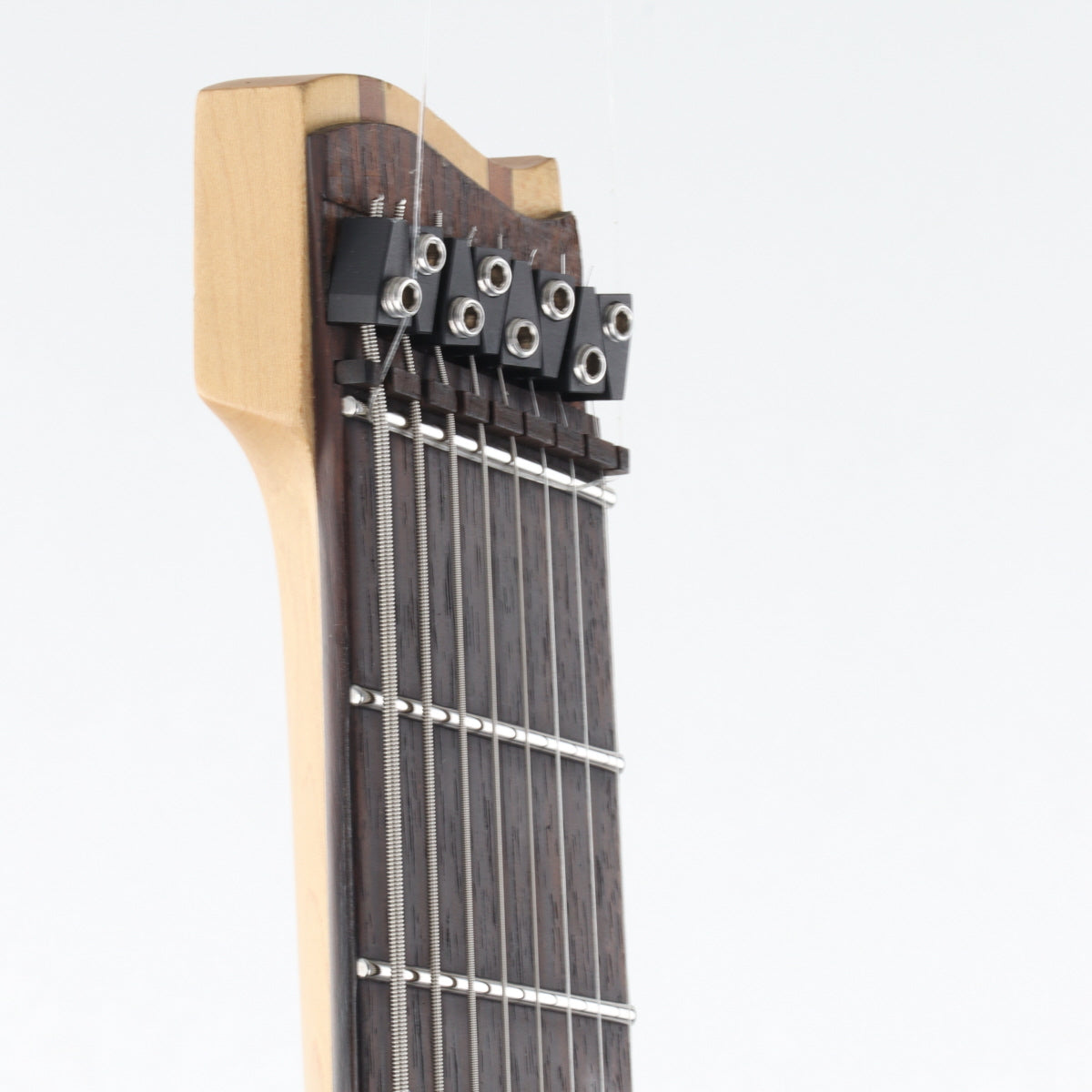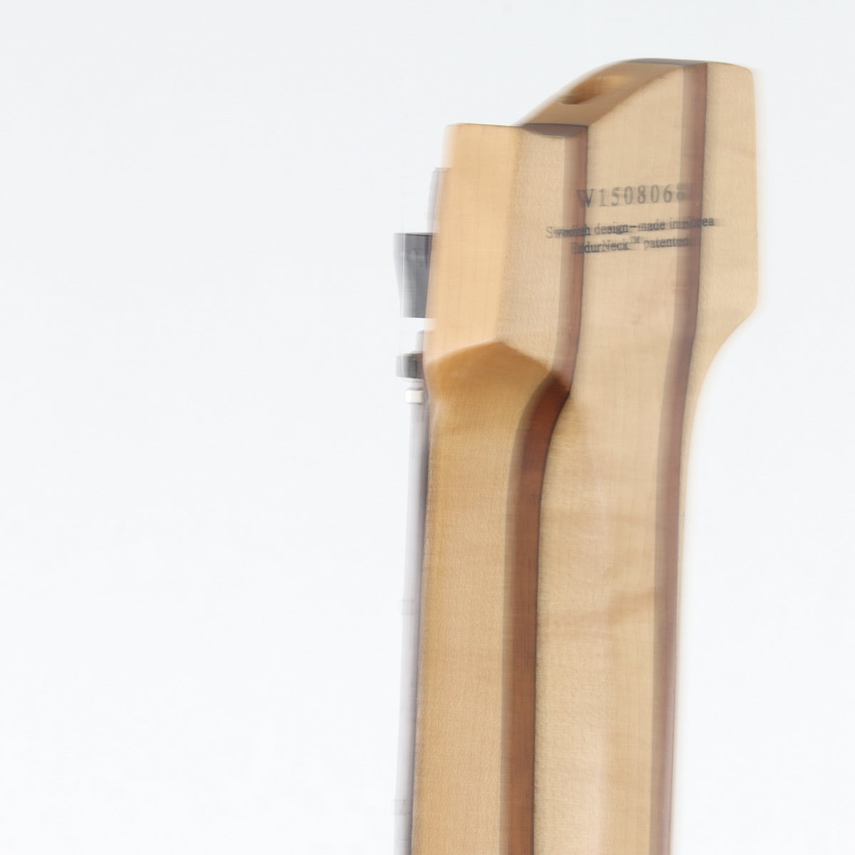 The headless neck with a unique EndurNeck shape and fan-shaped stainless steel fund frets allow for extremely natural fingering no matter which position the guitar is played.