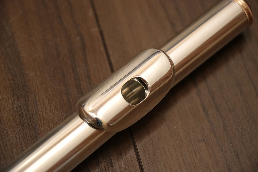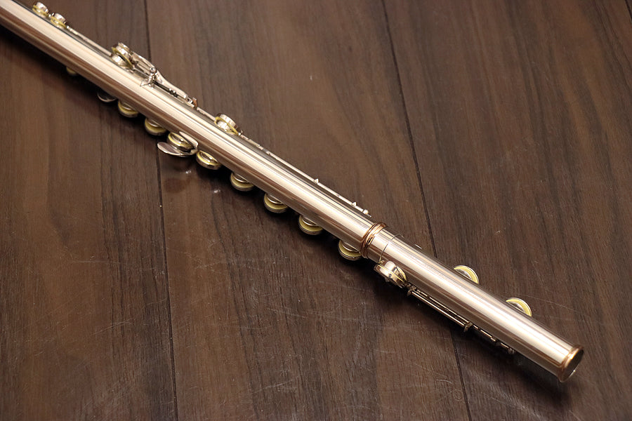 2005年頃まで製造されていたギブークラシックシリーズ。クラシカルな設計を受け継ぎ、ミヤザワフルートらしい歯切れの良いサウンドと正確なメカニズムが特徴的なモデルです。総銀製、引き上げトーンホール、カバードキィ、ポイントアーム、C足部管仕様。ヘッドクラウン内側に9Kの刻印があります。接合部リングは9K製と思われますが刻印等はありません。全体的に使用キズが見られますが大きなダメージはございません。全タンポ交換を含む全体調整済み。