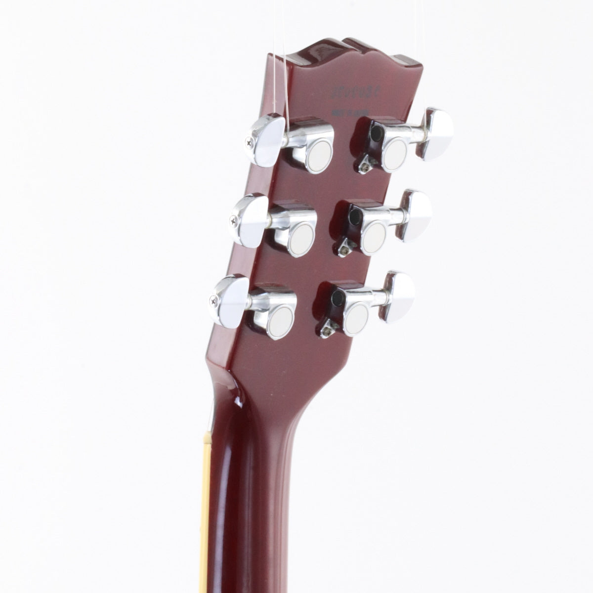 薄めのネックシェイプのマホガニーネック・ローズウッド指板にドットポジションマーク、セミアコースティック構造のメイプルボディになります。