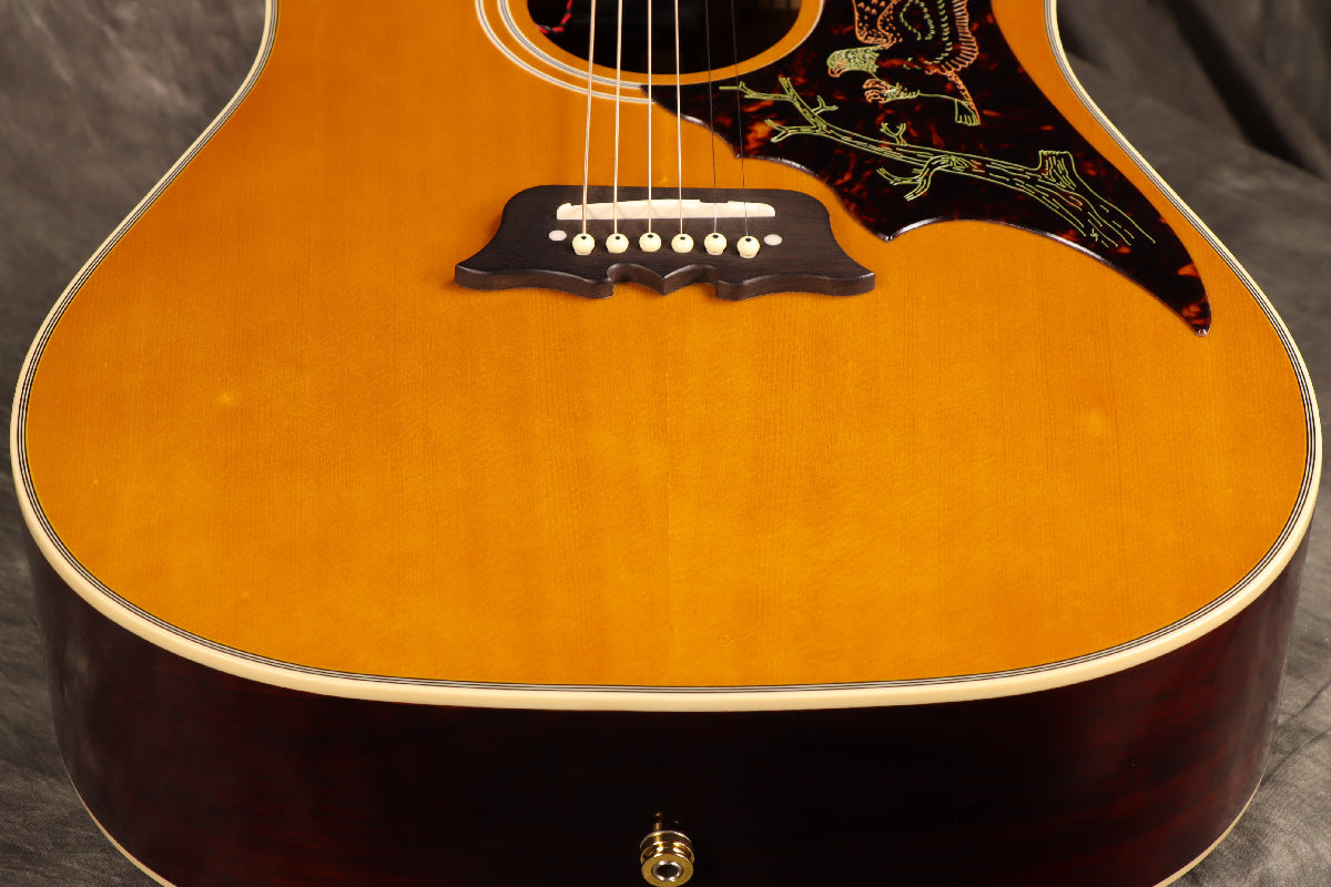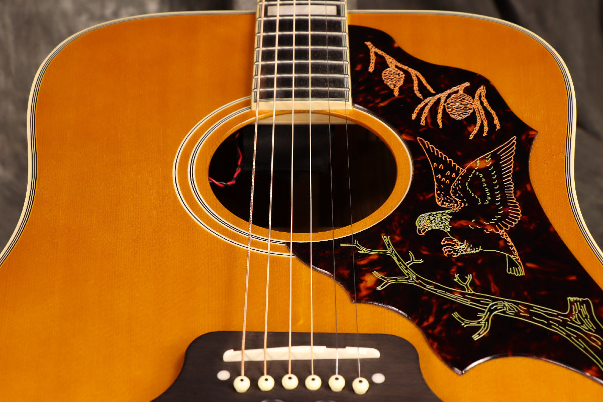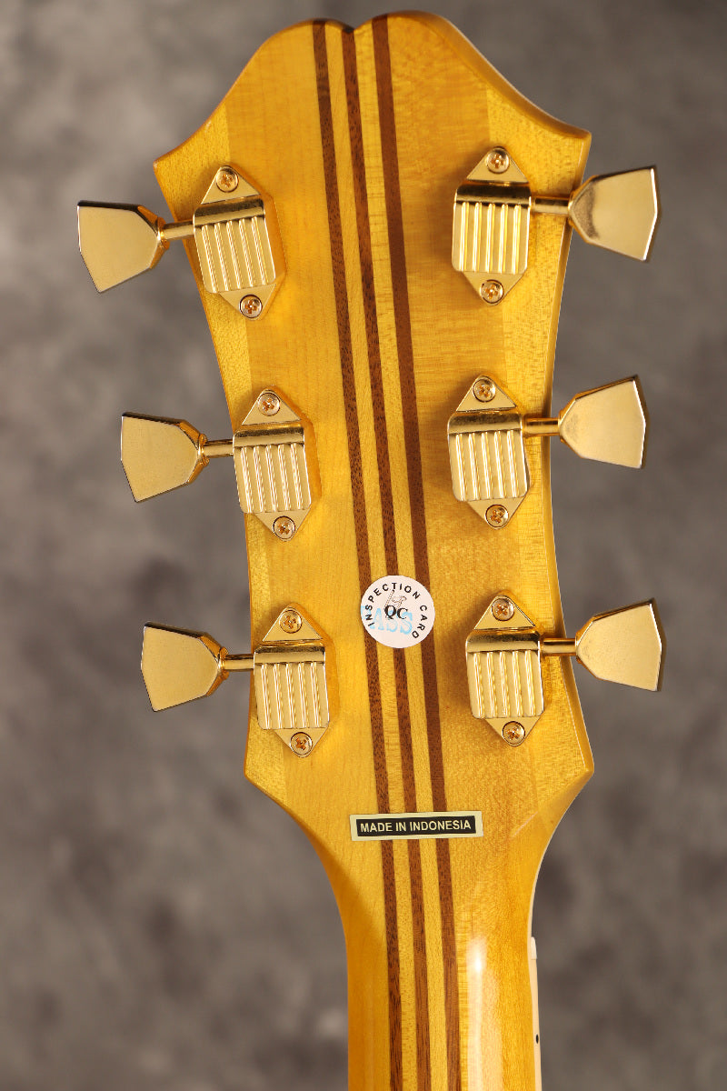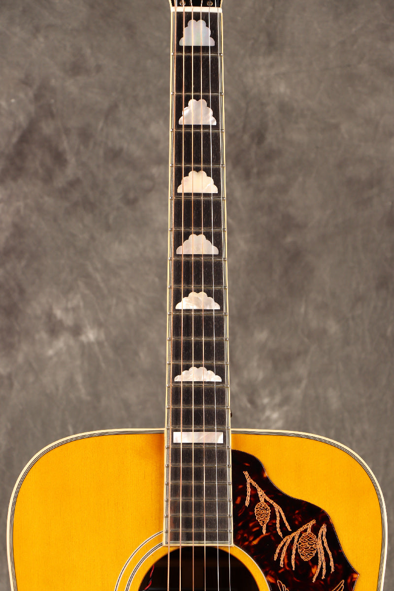 印象的な絵柄が施されたピックガードやマスタッシュブリッジ風のエボニーブリッジ、指板のクラウドインレイ、ワッフルバックのGoldペグ、エイジドグロスフィニッシュなどアンティークかつ高級感あるルックスが目を引きます。