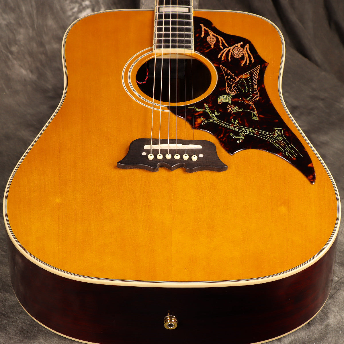 The pickguard has a striking pictorial design, a mustache bridge-style ebony bridge, cloud inlays on the fingerboard, waffle-back Gold pegs, and an aged gloss finish, all of which give the instrument an antique, high-end look.
